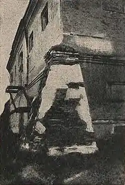 Каменное двухэтажное прямоугольное в плане здание размерами 21х14 м было накрыто вальмовой крышей. Углы укреплены мощными контрфорсами, которые по высоте доходили до середины второго этажа. В отделке фасадов были использованы элементы ренессансной ордерной пластики[1].