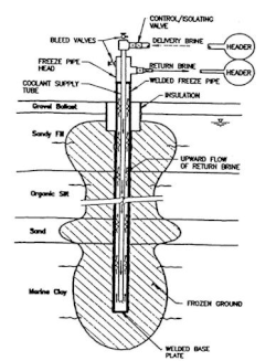 Трубы пропускаются через почву для замораживания, а затем по трубам пропускаются хладагенты, замораживающие почву. Замёрзший грунт может быть таким же твёрдым[уточнить], как бетон.