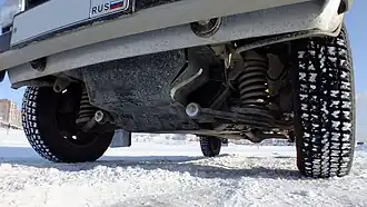 Как правило, у автомобилей с продольным расположением двигателя защищают только его поддон — коробка передач находится позади в относительной безопасности (при поперечном расположении двигателя и она оказывается в опасной зоне, в этом случае необходима защита не только мотора, но и корпуса коробки передач).