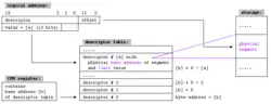 Физический адрес формируется следующим образом. В сегментных регистрах хранится селектор, содержащий индекс дескриптора в таблице дескрипторов (13 бит), 1 бит, определяющий к какой таблице дескрипторов будет производиться обращение (к локальной или к глобальной) и 2 бита запрашиваемого уровня привилегий. Далее происходит обращение к соответствующей таблице дескрипторов и соответствующему дескриптору, который содержит начальный 24-битный адрес сегмента, размер сегмента и права доступа, после чего вычисляется необходимый физический адрес путём сложения адреса сегмента со смещением из 16-разрядного регистра.