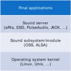 Звуковой сервер может обеспечить эти возможности, запустившись в качестве демона. Он принимает вызовы от различных программ и потоков звука, микширует потоки и отправляет необработанное аудио на аудиоустройство.