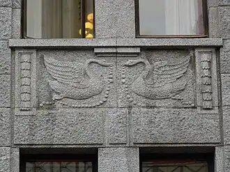 На уровне первого этажа высечен скульптурный фриз из пяти частей[14] со стилизованными в духе античности[15] фигурами (предположительно, продемонстрированы торговля или сбор дани и жертвоприношение Гермесу[16]), между окнами четвёртого этажа расположены овальные медальоны[2] с аллегориями частей света (Европы, Азии, Африки и Америки)[17]. Скульптурные работы выполнил В. В. Кузнецов[3], хотя сюжеты, приёмы композиции и расстановка фигур выполнены уже на известной по фотографии гипсовой модели здания, выполненной Троупянским (а значит, вероятно, он и является истинным автором композиции)[18]. По большей части фигуры фриза изокефальны, выражения лиц отрешённые[15].