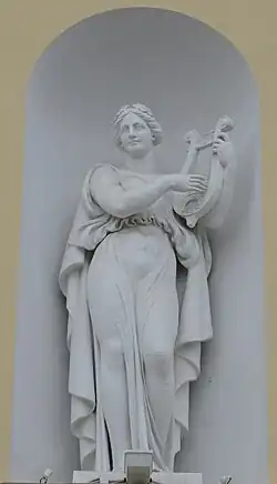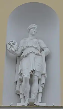 Здание окаймляет выразительный скульптурный фриз с античными театральными масками и гирляндами лавровых ветвей. В нишах на торцевых фасадах — статуи муз (Талии и Мельпомены[9]), на аттике главного фасада — квадрига Аполлона. Работы вели В. И. Демут-Малиновский, С. С. Пименов, П.Трискорни[8]. В 1840 году были сняты статуи с аттиков здания, в 1847 году убрали муз из ниш фасадов[10].
