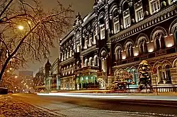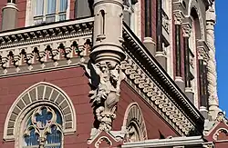 Монументальность здания подчёркивается широким карнизом, украшенным майоликой. Наружные стороны фасада закреплены витыми колонками с декоративными башнями, которые поддерживаются скульптурами величественных грифонов — крылатых львов, или полуорлов-полульвов. Интересно, что в античной мифологии грифоны считались хранителями золотых месторождений.