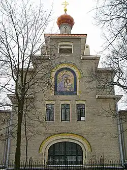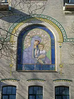 В комплексе имеется церковь во имя Христа Целителя с иконой Мадонны с младенцем авторства К. Петрова-Водкина на фасаде. Для иконы сделана арочная ниша (киот). Для восприятия издали и соответствия архитектурной основе рисунок лаконичен, его формы крупные, цвета плоские, контрастные кирпичной облицовке стен — синий, голубой, жёлтый и зелёный. Нимб заполнен цветочным золотым орнаментом. По словам самого художника, это была его первая грандиозная работа, хотя он остался недоволен цветом изразцов, в частности, желтизной лица Богоматери[9].