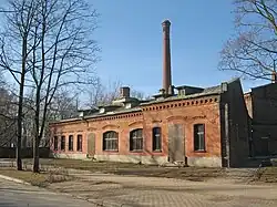 Главное здание стоит в южной части участка, два служебных флигеля — у северной[13]. Для защиты от наводнений уровень земли был поднят на полтора метра[14]. В одном из флигелей была механическая прачечная, электростанция и жильё, в другом — каретный сарай, лаборатория, дезинфекционная камера и покойницкая. Стены было задумано выложить светлой плиткой, но в итоге они облицованы лишь красным кирпичом, относятся к кирпичному стилю с декором из рельефных бровок и городковыми поясками[10]. Дымовая труба завершена оголовком с аркатурой[11].