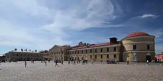 Здание двухэтажное, центральный ризалит выше боковых крыльев, над ним расположен низкий широкий треугольный фронтон. Крылья завершают круглые башни с плоскими куполами[10], в одной из них в центральной части раньше стояла дымовая труба. Строение стоит по западной границе Соборной площади, играет роль фона для колокольни Петропавловского собора[7].