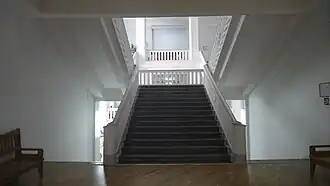 Монолитные гранитными колонны у главного входа поддерживают небольшой балкон. Лестница перед входом фланкирована столбами в форме обелисков, которые изначально служили для освещения входного узла.