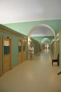 На втором этаже располагались конференц-зал, столовая и больница (по другим планам, лазарет был на первом этаже, а на втором — канцелярия[4]), на четвёртом были сделаны комнаты учащихся, причём потолки «для чистоты комнатного воздуха» были сделаны выше на 70 сантиметров. На первом этаже жили инспектора, гувернёры, находились хозяйственные помещения[2]. Комнаты воспитанников были расположены по сторонам шестиарочного коридора[7], подобные отдельные комнаты не предоставляло никакое другое российское закрытое учебное заведение[8]. С парадной лестницы был вход на любой этаж, стены главного входа также были раскрашены под розовый мрамор[5].