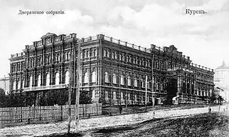 22 ноября (5 декабря) 1914 года Николай II, следуя на Кавказ в действующую армию, сделал остановку в Курске[39] и посетил один из военных госпиталей, располагавшийся в здании Дворянского собрания и рассчитанный на 75 офицеров и военнослужащих нижних чинов (попечительницей этого госпиталя была жена предводителя дворянства Курской губернии Н. В. Дондукова-Изъединова)[40]. К приезду императора в верхней части фасада Дворянского собрания был вывешен вензель «Н II А», располагавшийся под изображением короны Российской империи[16][32].