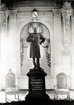 По постановлению губернского дворянского собрания от января 1896 года в Большом зале в 1902 году установлен памятник императору Александру III в виде бронзовой статуи царя на сером мраморном четырёхугольном пьедестале[30] с надписью «Императору Александру III благодарное Курское дворянство»; в торжественном открытии памятника 1 (14) сентября 1902 года принимал участие император Николай II, прибывший в Курск на военные манёвры[31][32][33][34][35]. Епископ Курский и Белгородский Лаврентий с духовенством совершил богослужение, после чего предводитель дворянства Курской губернии А. Д. Дурново сдёрнул с памятника белое шёлковое покрывало и прочёл монарху благодарственный адрес. Через красивую анфиладу холлов Николая II провели в верхние этажи здания, где он осмотрел дворянский пансион-приют[36].