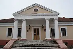 Архитектурно-пластичным акцентом здания является четырёхколонный портик, которым выделяется главный вход[7]. Попарно установленные колонны поддерживают деревянный треугольный фронтон и антаблемент. Главный фасад в боковых частях раскрапированы рустированными лопатками; большие прямоугольные окна в простых наличниках. Под домом находятся сводчатые подвалы[7].