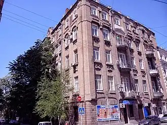 Пятиэтажный кирпичный дом построен в стиле модерн. Имеет Г-образную конфигурацию в плане[4]. Композиции обоих фасадов асимметричны[3]. Первый этаж отделан штукатурным рустом, этажи со второго по пятый имеют лаконичный кирпичный декор[3]. Второй, третий и четвёртый этажи объединены лопатками с архивольтом[4]. Между лопатками установлены полукруглые балконы. Простенки пятого этажа южного фасада декорированы нишами с геометрическим орнаментом. Здание увенчано парапетом с одиночными фронтонами (фронтон восточного фасада утрачен)[3].