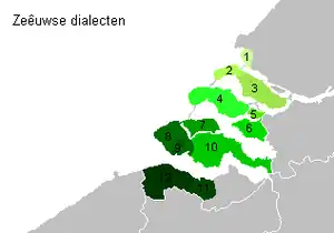 Зеландский диалект является в некотором смысле промежуточным между голландскими диалектами к северу и западнофламандскими диалектами к югу. Это связано в частности с тем, что в Средние века и начале Нового времени Зеландия находилась в сфере влияния как Голландии, так и Фландрии. В зеландских диалектах отчётливо прослеживается постепенное увеличение числа голландских языковых элементов по мере продвижения с юга на север. В то же время в зеландском ареале довольно последовательно распространены собственные диалектные черты и ясно очерчиваются диалектные границы с Голландией и Фландрией, поскольку морские проливы способствуют образованию узких пучков изоглосс с большим числом диалектных явлений.