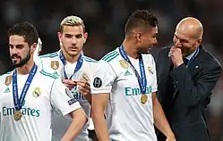Иско, Тео Эрнандес, Каземиро и Зинедин Зидан (слева направо) на церемонии вручения медалей за победу в Лиге чемпионов 2018 года