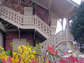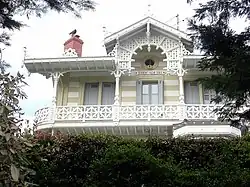 Очень своеобразная, она сочетает элементы испанского стиля и бельведер, присущий рустированным итальянским виллам. Важное место в отделке здания отведено полихромии, использованной как в каменной кладке, так и в украшениях из резного дерева.