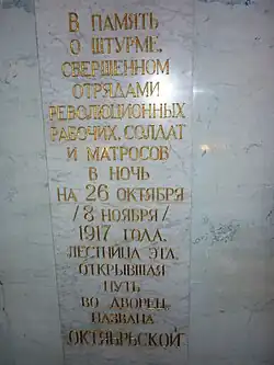 • В ночь с 25 на 26 октября (7—8 ноября) 1917 года в дни Октябрьской революции Красная Гвардия, революционные солдаты и матросы окружили дворец, который охраняли гарнизон юнкеров и женский батальон. Северо-западный ризалит дворца был обстрелян картечью из орудий Петропавловской крепости. К 2 часам 10 минутам ночи 26 октября (8 ноября) восставшие штурмом взяли дворец, арестовали Временное правительство. В кинематографе штурм Зимнего дворца изображался как битва.
