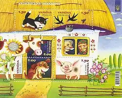 «Українське подвір’я» з 5 марок: Котик; Ластівки; Корова; Собака; Порося. с укр. — «Блок „Украинское подворье“ из пяти марок: | 1,50 1,50 2,00 2,00 1,50 гривны |