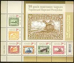 - ↑ Блок «90 років поштовим маркам Української Народної Республіки» з 6-ти марок/2011. (укр.). КМД УДППЗ «Укрпошта». poshta.kiev.ua. Дата обращения: 18 апреля 2018. Архивировано из оригинала 18 апреля 2018 года.