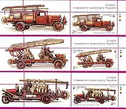 Серія «Історія пожежного транспорту України»: Пожежний автонасос «Бенц-Гаггенау» (1916)[39]; Пожежна автодрабина «Магірус» (1921)[40]; Пожежний автонасос «ПМГ-3» (1948)[41]. с укр. — «Серия «История пожарного транспорта Украины»: