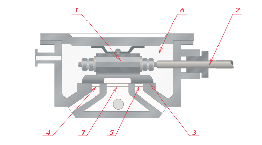 Крановый золотник по существу представляет собой коробчатый золотник 1, согнутый вокруг оси, перпендикулярной направлению его движения, и вставленный в цилиндрическую втулку 2 с двумя окнами 3 и 4. Качаясь вокруг неподвижной оси 5, золотник сообщает или разобщает окна с камерами 6 и 7.