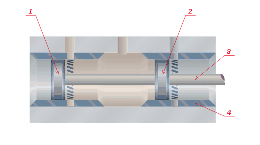 Цилиндрический золотник по принципу действия аналогичен коробчатому, но полностью уравновешен. Такой золотник обычно имеет два поршня 1 и 2 на общем штоке 3, перемещающихся в снабжённой окнами втулке 4. В системах гидравлического регулирования высокой точности цилиндрическому золотнику иногда сообщают непрерывное вращательное движение вокруг оси или колебательное вдоль оси с целью повысить чувствительность системы путём замены трения покоя трением скольжения.