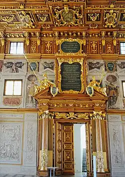 Великолепие Золотого зала не в последнюю очередь связано с его многочисленными потолочными и настенными росписями, которые ответственный дизайнер интерьеров Иоганн Матиас Кагер тщательно изготовил и установил в различных размерах и формах. На кессонном потолке, вырезанном из орехового дерева , основная картина — овальное изображение Sapientia (Мудрости), окруженное двумя большими круглыми изображениями. Они, в свою очередь, окружены четырьмя овалами. К внешнему краю потолка также прикреплены 24 эмблемы.