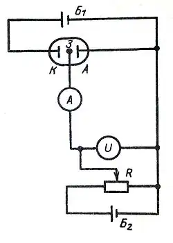 Измерительная система включает в себя измерительный зонд, опорный электрод – противозонд (в качестве него может выступать анод А или катод К, обычно в качестве опорного используют анод, так как в этом случае требуется источник зондового смещения Б2 на меньшее предельное напряжение) и источник напряжения (Рис. 2). Питание разряда осуществляется источником Б1. Зонду придают различные значения потенциала, относительно опорного электрода. Погруженный в плазму, зонд окружается двойным электрическим слоем (призондовый слой) и, фактически, ВАХ зонда является ВАХ слоя. В случае, когда размеры измерительного зонда много меньше размеров опорного электрода, ВАХ системы определяется слоем у измерительного зонда (система одиночного зонда).