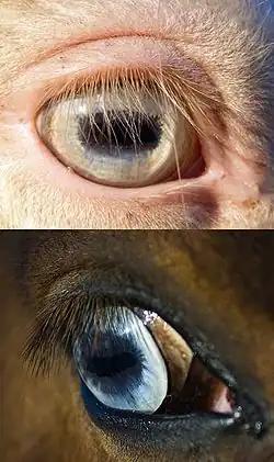 У большинства лошадей глаза тёмно-коричневые, но радужка бывает разных цветов, включая голубой, светло-коричневый, жёлтый и зелёный. Голубые глаза не являются редкостью, они связаны с наличием белых отметин или пегой мастью[5]. У лошадей с белыми отметинами полностью или частично голубыми могут быть как оба, так и один глаз.