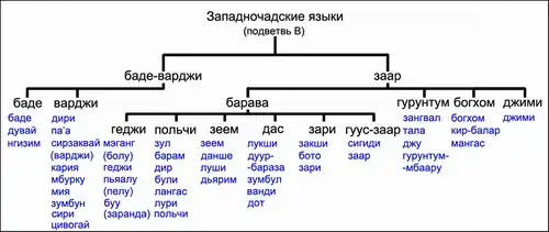 - ↑ Newman P. 36. Hausa and the Chadic Languages // The World’s Major Languages / Edited by B. Comrie. — Second Edition. — London: Routledge, 2009. — P. 619 — Table 36.1 The Chadic Language Family (Inventory and Classification). — ISBN 0-203-30152-8.