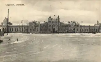 ![]() | Саратовский вокзал Коренная перестройка и расширение существовавшего до этого здания. В 1977 году вокзал был в очередной раз перестроен и утратил преданный ему Зыбиным вид | 1900 | Привокзальная площадь | [12] |
