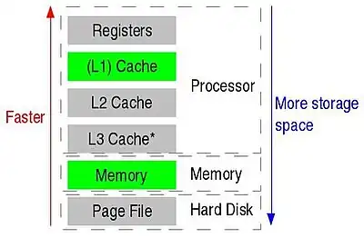Большинство программистов обычно предполагает, что память делится на два уровня, оперативную память и дисковые накопители, хотя в ассемблерных языках и ассемблерно-совместимых (типа C) существует возможность непосредственной работы с регистрами. Получение преимуществ от иерархии памяти требует совместных действий от программиста, аппаратуры и компиляторов (а также базовая поддержка в операционной системе):
