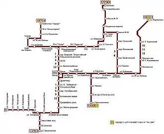 Примечание: жёлтым цветом помечены маршруты, работающие только в часы пик. Также эти маршруты являются частью 7,10 и 12 маршрута на которые переходят вагоны в утренние, дневные и ночные часы при заезде в парк, а также в случае перекрытия путей и невозможности работать по своим маршрутам, также есть на случай быстрого разворота для возвращения в график движения сохраненные старые кольцевые конечные на остановках Тимирязева и Воткинской переулок.