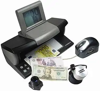 - ↑ Определение подлинности защищённой полиграфической продукции // Ценные бумаги: регистрация, экспертиза, фальсификации.-2008.-№ 12.-С.27.-ISBN 5-9286-0036-4