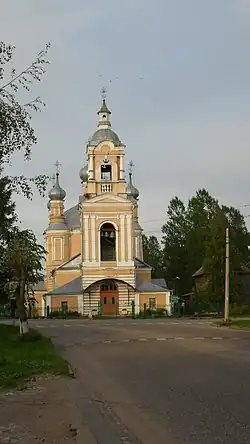 Пятиглавый каменный храм с трапезной и трёхъярусной колокольней. Основное здание представляет собой двухсветный четверик[5].