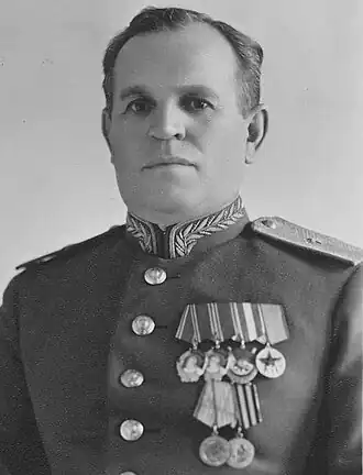 - ↑ Список генералов и офицерского состава Главного военно-химического управления Красной Армии, имеющих право на получение медали «За победу в Великой Отечественной войне 1941—1945 гг.»
