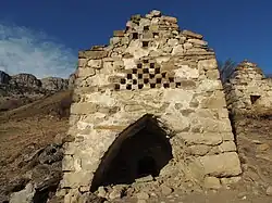Погребения в каменных ящиках встречаются в горах Ингушетии, они тут получили широкое распространение[35]. Наиболее многочисленными являются склеповые погребальные памятники — «Маьлха-кашамаш» («Солнечные могильники»). Самые ранние из них — подземные склепы с погребальными камерами, каменными полками и нишами, относятся к периоду XI—XIV вв. Полуподземные склепы обычно располагались на горных склонах. Их выступающая наружу фасадная часть венчается либо плоской, либо двускатноступенчатой кровлей. Они датируются второй половиной XIII—XV вв.