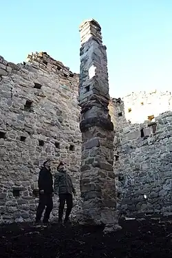 Первый этаж жилой башни отводился под хлев, в котором скот был привязан к яслям в определенной последовательности. Для лошади устраивали особый угол. Часть этого помещения огораживалась плетнем: в этом углу хранили зерно. В некоторых случаях для мелкого рогатого скота освобождали весь второй этаж, куда скотину подгоняли по устроенному для этого деревянному настилу. Посередине башни с самого основания возвышался четырехугольный каменный столб («ердабӏоагӏа»), служивший опорой для основных толстых балок межэтажных перекрытий. «Поперек их проходили более тонкие балки, упирающиеся одним концом на выступающие параллельно им камни противоположной стороны. Сверху балок укладывался хворост, на который насыпалась и утрамбовывалась глина»[33].