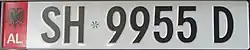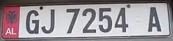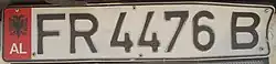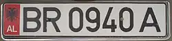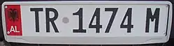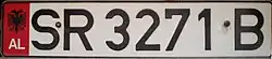 Регистрационный номерной знак Албании выполняется чёрными буквами на белом фоне. Повторяет вид итальянских номеров образца 1994 года.