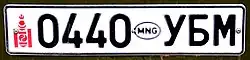 Номерные знаки транспортного средства Монголии состоят из четырёх цифр и трёх кириллических букв. Дизайн напоминает советский стандарт номерных знаков с 1980 по 1993 (ГОСТ 3207-77), у которых было четыре цифры и три буквы.