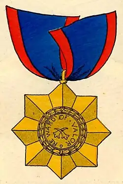 Золотая восьмиконечная звезда с синим кругом в центре. На круге золотой лавровый венок и скрещенные мечи и девиз «награжден за доблесть» (1837-1944), затем «награжден за храбрость» (1944-1947).