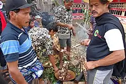 На Яве, Суматре и в некоторых других местностях распространён способ приготовления мяса, курятины, рыбы и морепродуктов в густом соусе по типу индийского карри — гулай. На Сулавеси и Калимантане мясо, курятина и морепродукты запекаются в полых коленцах бамбука — так же, как запекается рис в леманге, — эти блюда традиционно являются важным элементом ритуальных трапез в ходе различных семейных и общинных церемоний, в частности, поминок. Кроме того, в ряде регионов применяется жарка цельных туш животных на вертеле: на Бали, Северной Суматре и Сулавеси так обычно готовятся свиньи, на Яве — козы[29][86]. У папуасских народов Новой Гвинеи практикуется запекание свиных туш — целиком либо разрубленных на крупные куски — в ямах, выложенных раскалёнными камнями и прикрытыми листьями и дёрном: в ходе крупных общинных торжеств таким образом могут одновременно готовиться десятки свиней, забитых непосредственно перед запеканием в ходе особой церемонии[75].
