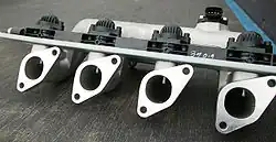 • Распределённый впрыск, или многоточечный впрыск[1] — каждый цилиндр обслуживается отдельной изолированной форсункой во впускном коллекторе вблизи впускного клапана. В то же время различают несколько типов распределённого впрыска: