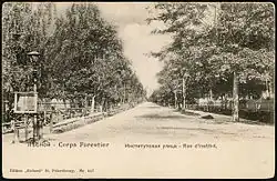 В 1811 году в северные окрестности Петербурга было переведено Царскосельское лесное училище. Расположенное в постройках бывшей английской фермы, учебное заведение сначала называлось Форст-институтом (от немецкого «Форст» — лес), а затем, с 1814 года, — Лесным институтом. Проспект, начинавшийся от построек Лесного института, получил название Институтский, а вся местность — Лесной. Во второй половине XIX века проспект назывался Большим проспектом Лесного и проходил от Новосильцевской улицы до Малой Объездной улицы. В начале XX века на Институтском проспекте, в доме 23 открылось Коммерческое училище Общества распространения коммерческого и художественно-промышленного образования.