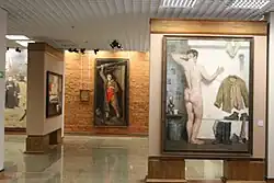 Выставочное пространство первого этажа начинается с работ художников конца XIX — начала XX веков. После реновации 2016 года стены залов окрашены в яркие цвета, чтобы воссоздать дух эпохи перемен. Составной частью экспозиции является один из самых больших разделов музейной коллекции — советская живопись первой половины XX века. В число представленных произведений входят полотна Аркадия Пластова, Сергея Герасимова, Александра Дейнеки, Юрия Пименова, Георгия Нисского и Исаака Бродского[4][21]. Одним из самых ценных экспонатов считается полотно «Девушка, завязывающая ленту на голове», выполненное Александром Дейнеки в 1930-х годах[12][22].