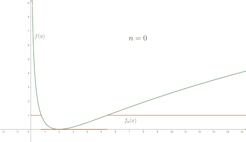 Указанная функция (коричневая) при возрастающем на фоне функции (зелёная)