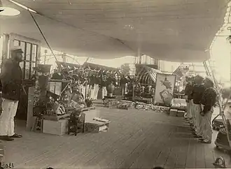 Накануне отплытия, 6 [18] мая, цесаревич впервые отпраздновал день рождения вдали от родины[48]. По описанию «Правительственного вестника», в тот день «три парохода, нагруженные самыми разнообразными подношениями… вышли из Осаки и, став перед фрегатом Его Высочества, высадили депутацию, которая просила о милостивом принятии посильных приношений… К вечеру палуба „Памяти Азова“ была буквально завалена художественными произведениями, сельскими продуктами, лакомствами и т. п.»[49]; на корабль с поздравлениями прибыли министр иностранных дел Японии Аоки Сюдзо и принц Китасиракава Ёсихиса[50], вечером был дан салют[51].