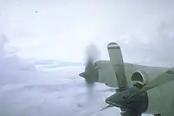 Опустив нос под углом 13°, самолёт в 17:28 перешёл в снижение и достиг скорости 535 км/ч, а в 17:28:14 на высоте 277 метров начал входить в правый крен. Постепенно стало светлеть, что свидетельствовало о близости к глазу, однако затем резко потемнело, после чего возник удар, приведший к трёхкратной перегрузке, а следом ещё один, при этом различное оборудование сорвалось со своих креплений и валялось по салону. Третий удар уже с шестикратной перегрузкой сотряс весь самолёт. Одновременно с этим в кабине экипаж увидел по приборам, что в двигателе №3 (правый внутренний) пожар, а в салоне через иллюминаторы видно, как из двигателя появился факел пламени длиной около 9 метров. Позже было установлено, что температура в двигателе достигала 1260 °C. Тогда в 17:28:30 двигатель отключают. Экипаж почти не контролировал свой самолёт, который начал быстро входить в правый крен. Затем примерно в 17:29 турбулентность резко прекратилась — на высоте 270 метров над водой и в крутом правом крене NOAA 42 наконец достиг спокойного эпицентра урагана Хьюго[6].