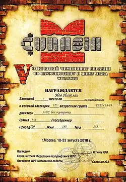 - ↑ Протокол V Открытый Чемпионат Евразии по пауэрлифтингу и жиму лежа среди мужчин и женщин AWPC/WPC 17-22 августа 2010 г. г. Москва. Дата обращения: 6 мая 2013. Архивировано 17 мая 2013 года.