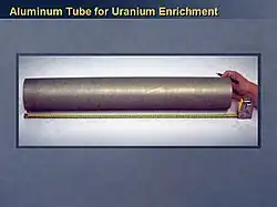 Алюминиевые трубки, закупленые Ираком и перехваченые в Иордании в 2001 году. В сентябре 2002 года Белый Дом представил их публике как доказательство того, что Ирак активно разрабатывает атомное оружие. Ещё до вторжения в Ирак в 2003 году многие усомнились в обоснованности этих обвинений. После вторжения Группой по изучению Ирака (Iraq Survey Group) было установлено, что трубки скорее всего предназначены для производства обычных 81-мм реактивных снарядов. Никаких признаков программы по созданию атомного оружия или по применению трубок в качестве роторов газовых центрифуг для разделения изотопов урана обнаружено не было[1].